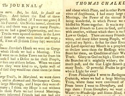 "From Thomas Everden's house, we went to George Bruit's, where we held a meeting. This friend and I visited an Indian town near his house, as I was eager to meet these people, having never seen them before. When we arrived at the town, they were kind to us, spoke well of our Quaker community, and assured us they would not cheat us (as others had done).