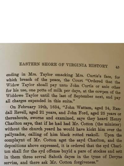 On February 19th, 1634, "John Wattam, aged 24, Randall Revell, aged 21 years, and John Ford, aged 25 years or thereabouts, sworne and examined, saye they heard Henry Charlton saye, that if he had had Mr. Cotton (the minister) without the church yeard he would have kickt him over the pallyzados, calling of him black rotted raskoll. Upon the complaynt of Mr. Cotton agst the sayd Charlton, and the depositions above expressed, it is ordered that the syd Charl-ton shall for the syd offense buyld a pare of stockes and sett in them three sevral Saboth dayes in the tyme of Devyne serviss, and there ask Mr. Cotton forgiveness."