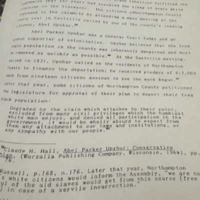 This passage discusses Abel Parker Upshur, a General Court Judge in Virginia, and his strong support for colonization, specifically the removal of free black people from Northampton County.